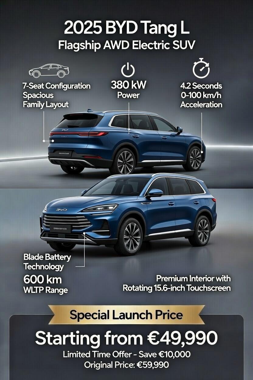 Discover the future of family driving with the 2025 BYD Tang L Flagship – a powerful, spacious 7-seater electric SUV designed for performance, safety, and sustainability. Powered by BYD's advanced e-Platform and Blade Battery technology, this flagship model delivers exceptional range, rapid charging, and dynamic all-wheel-drive handling. Ideal for growing families or those seeking eco-friendly luxury without compromise.